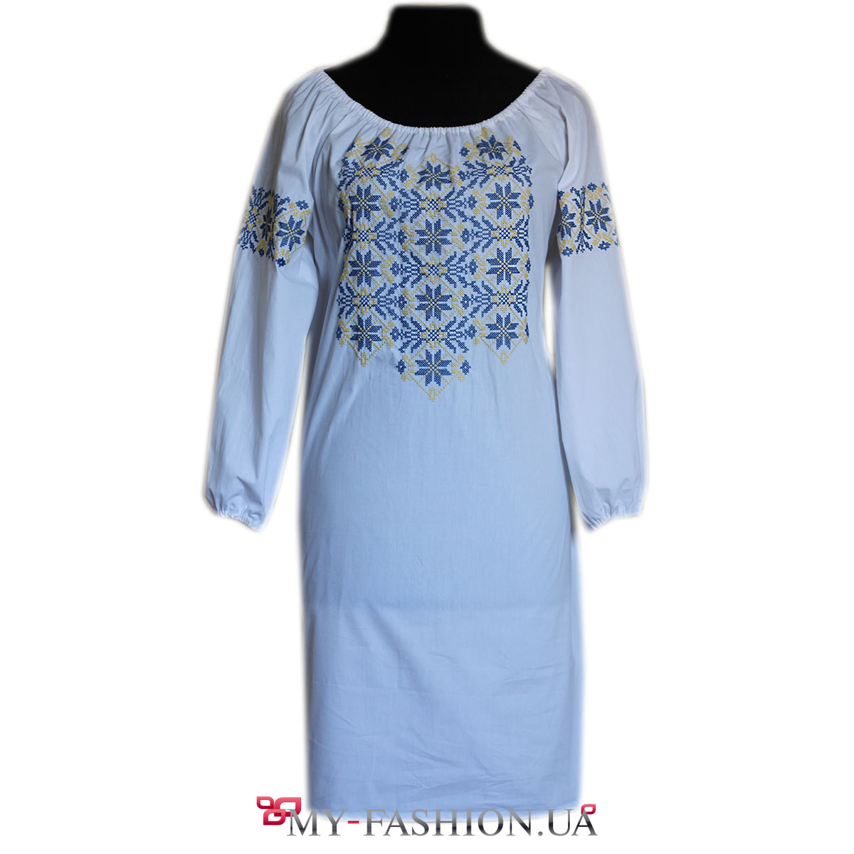 Аутентичное платье-вышиванка свободного кроя. Изделие очень удобно в ношении и элементарно в уходе. Рукав и горловина посажены на резинку, которая создаёт красивые мелкие склады на материи. Полочка и рукава декорированы красивой машинной вышивкой крестиком. Материал: рубашечная ткань. Состав: 80% - хлопок, 20% - полиэстер. Можно выполнить на заказ в любом необходимом размере. Также возможен пошив изделия из батиста или льна (цену уточняйте при заказе).