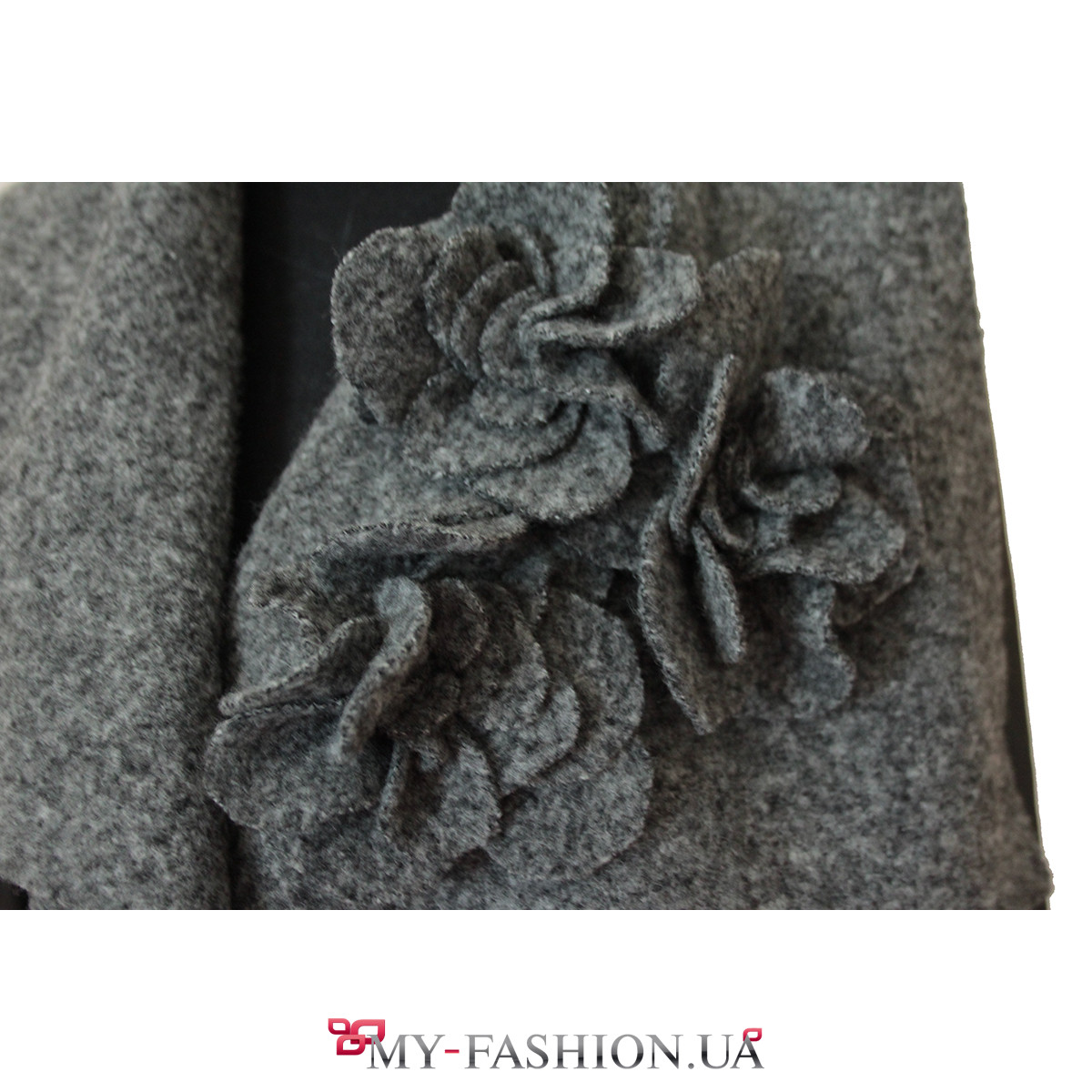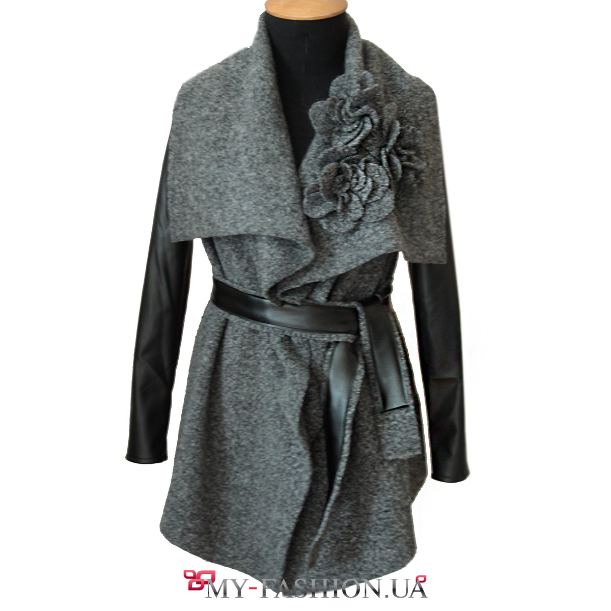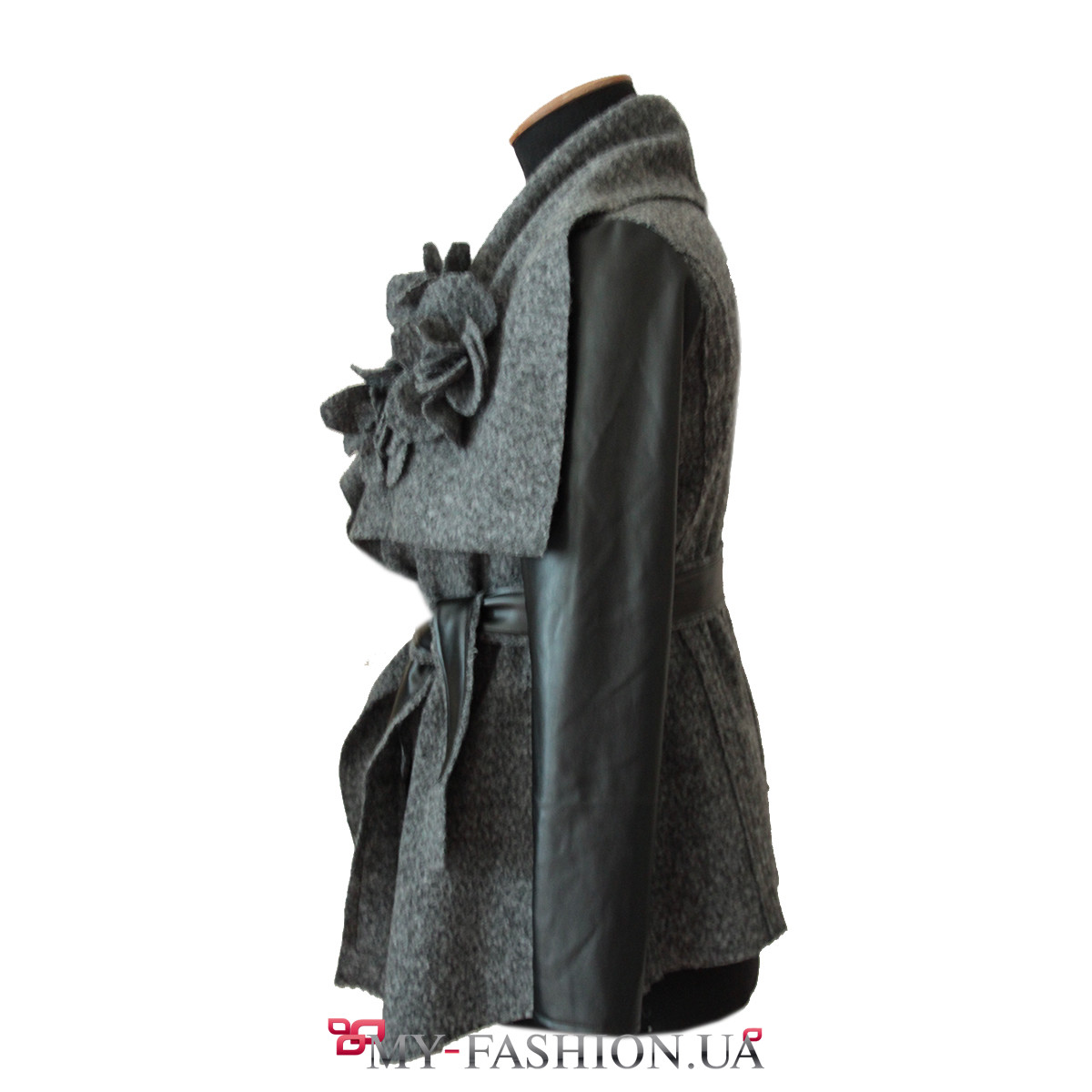 Элегантное женственное пальто из валяной шерсти будет прекрасно сочетаться с классическим офисным платьем, юбкой-карандаш или узкими брюками. Изделие выполнено из тёплой валяной шерсти приятного серого цвета. Рукава изготовлены из высококачественной искусственной кожи. Изделие без застёжек, надевается на запах и подвязывается тонким поясом с чёрной кожаной вставкой. Широкий отложной воротник декорирован шерстяными цветами. Материал: валяная шерсть, искусственная кожа. Доступно в разных размерах.