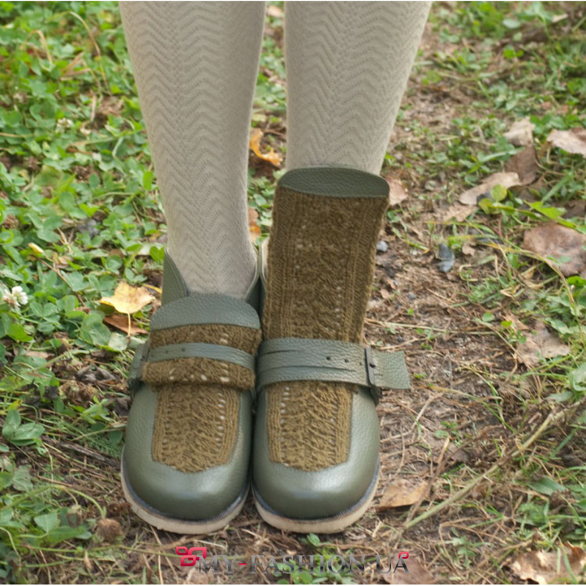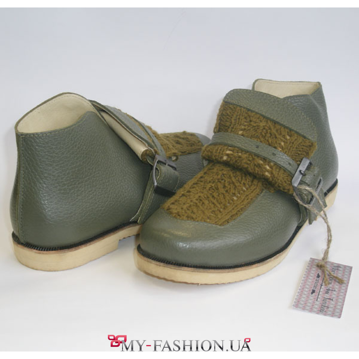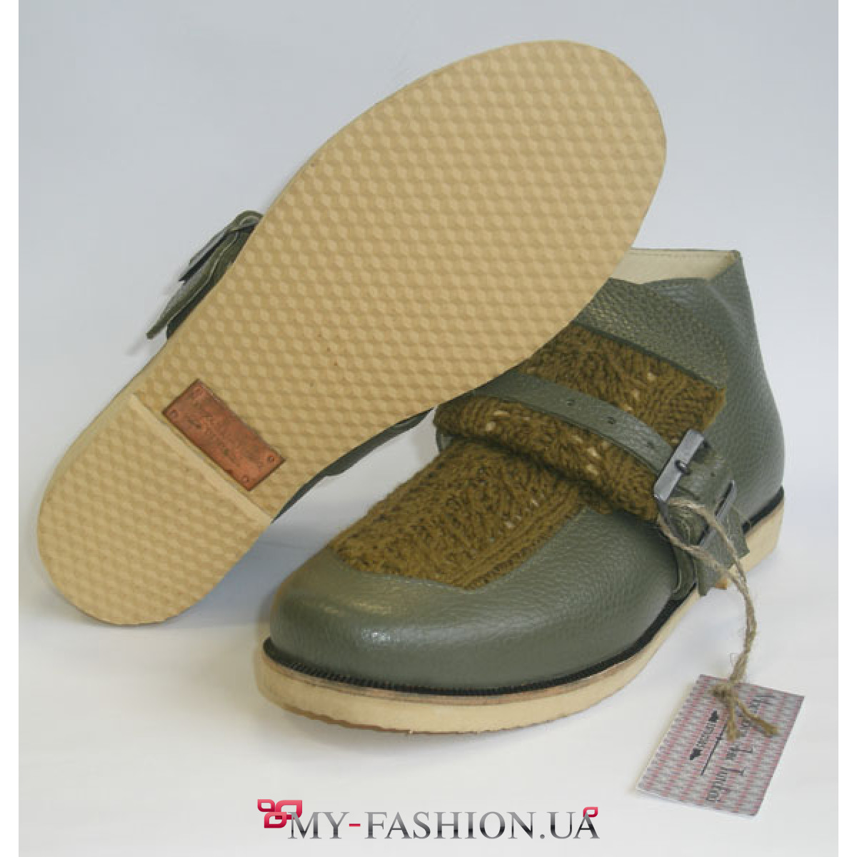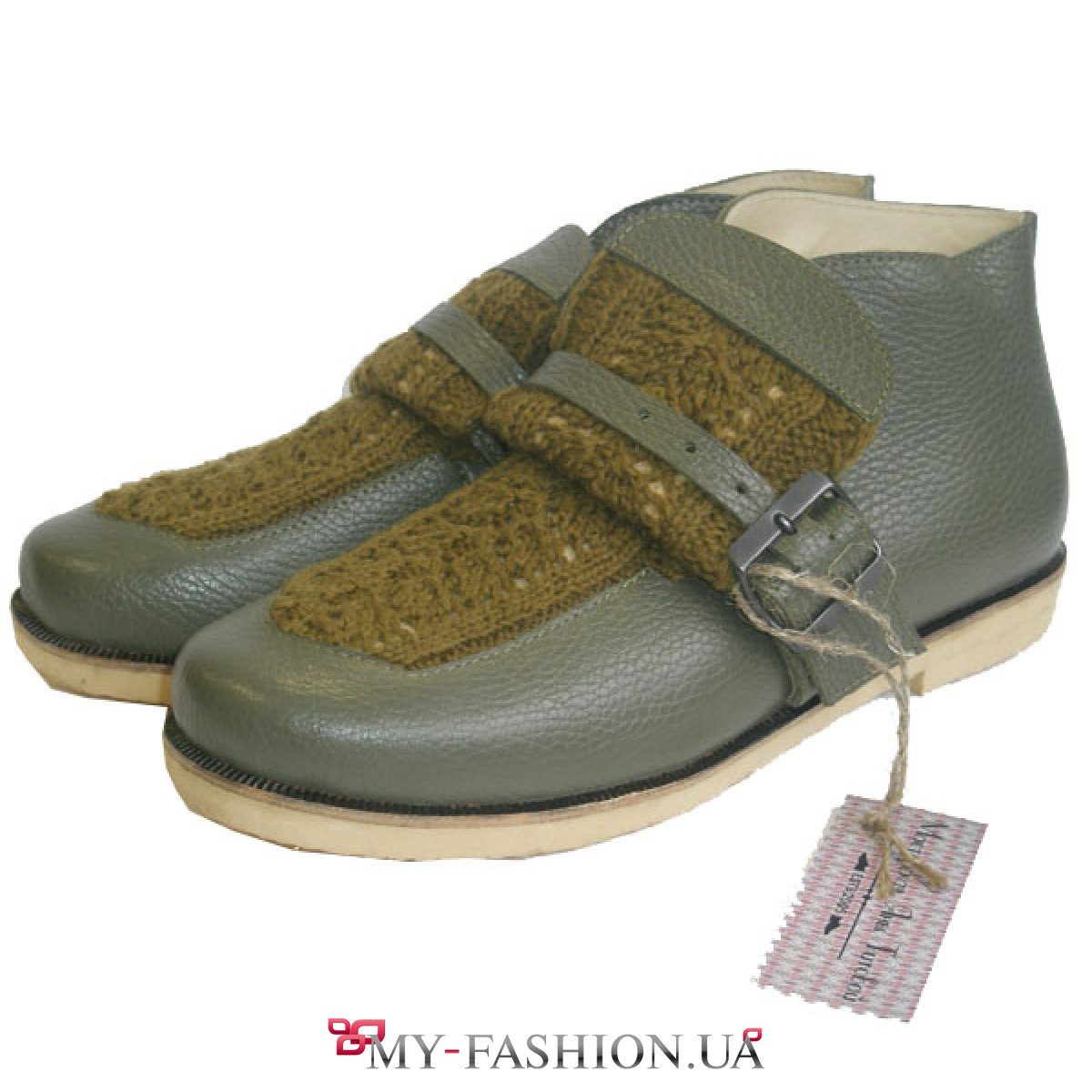 Ботинки женские с вязаной вставкой переходящей в язычок Эксклюзивная обувь. Женские ботинки на стопе фиксируются благодаря ремешку на пряжке. Верх и подкладка модных ботинок – натуральная кожа, подошва – микропористая резина. Цвет – оливковый. Размер 38. Обновляя гардероб, не забудьте про сумку. В нашем огромном магазине женских сумок обязательно найдётся то, что нужно.