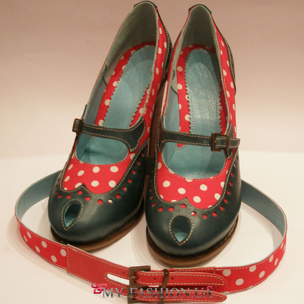 Игривые туфли в горошек купить с вырезом "капелька". Женские дизайнерские туфли сочетают классические олд-скульные линии кожаных деталей с ярким текстилем. Перфорация по краю деталей разбавляет контрастный переход цветов. Модель выполнена из сочетания натуральной кожи и х/б текстиля, подклад - натуральная кожа. Туфли очень удобны за счет скрытой платформы в 2см, что компенсирует высоту каблука (10см), оформленного под наборной. Для завершения образа предлагаем поясок в этом стиле. Великолепное платье Киев вы выберете в основной категории нашего сайта.