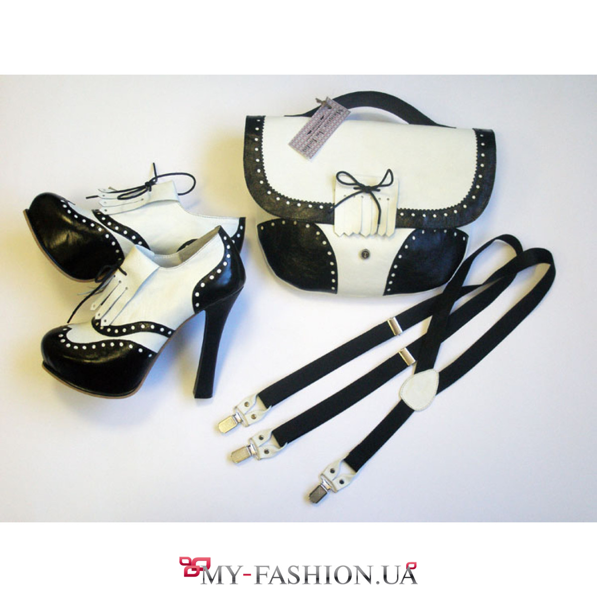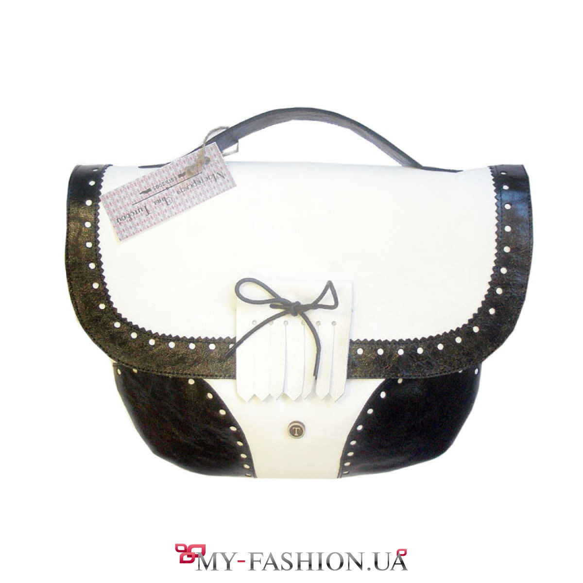 Женская сумка в стиле "Гольф". Сумка выполнена в классическом сочетании - черного и белого цветов. По краю детали обработаны фигурными ножницами-зигзаг и перфорацией. Сумка застегивается на магнит. На клапане сумки есть характерная деталь гольф-стиля в виде язычка от обуви с бантиком. Размер сумки 28х24см. В этом стиле можно подобрать полуботинки и подтяжки. Великолепные коктейльные платья Вы увидите в главной категории этого сайта.