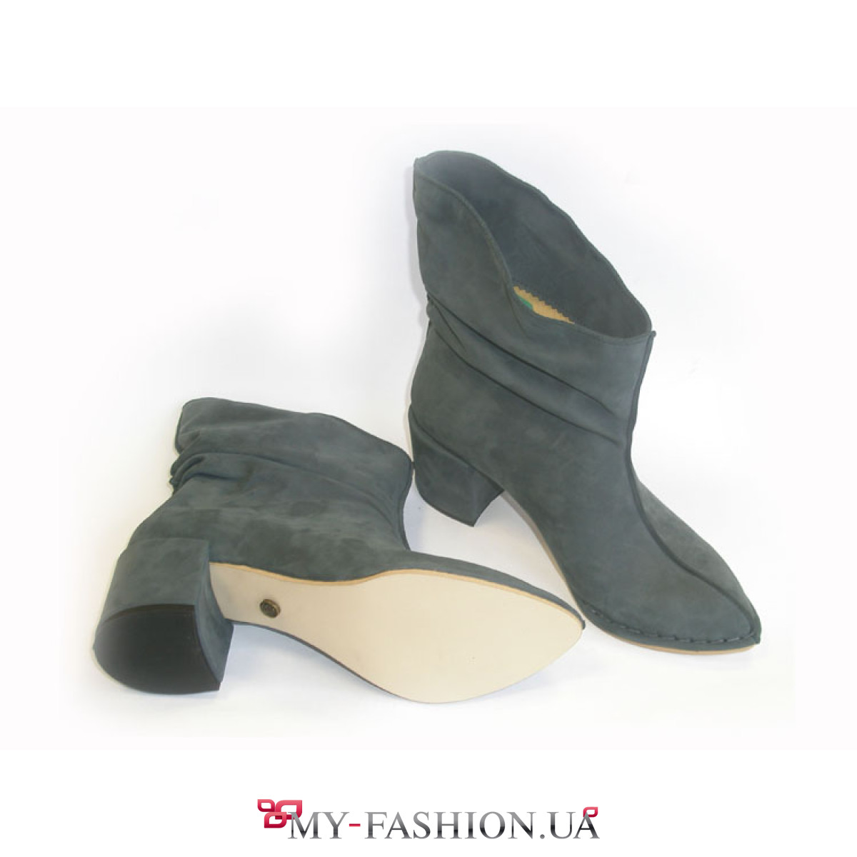 Красивые женские полусапожки свободного покроя с передним и задним декоративным наружным швом. Модель выполнена из кожи-нубук, подклад - кожа, каблук обтянут кожей верха. Носочная часть декорирована обьемной губой со швом ручного плетения. Высота каблука 5см. Носите такие красивые ботильоны с яркими джинсами и модными платьями разных цветов.