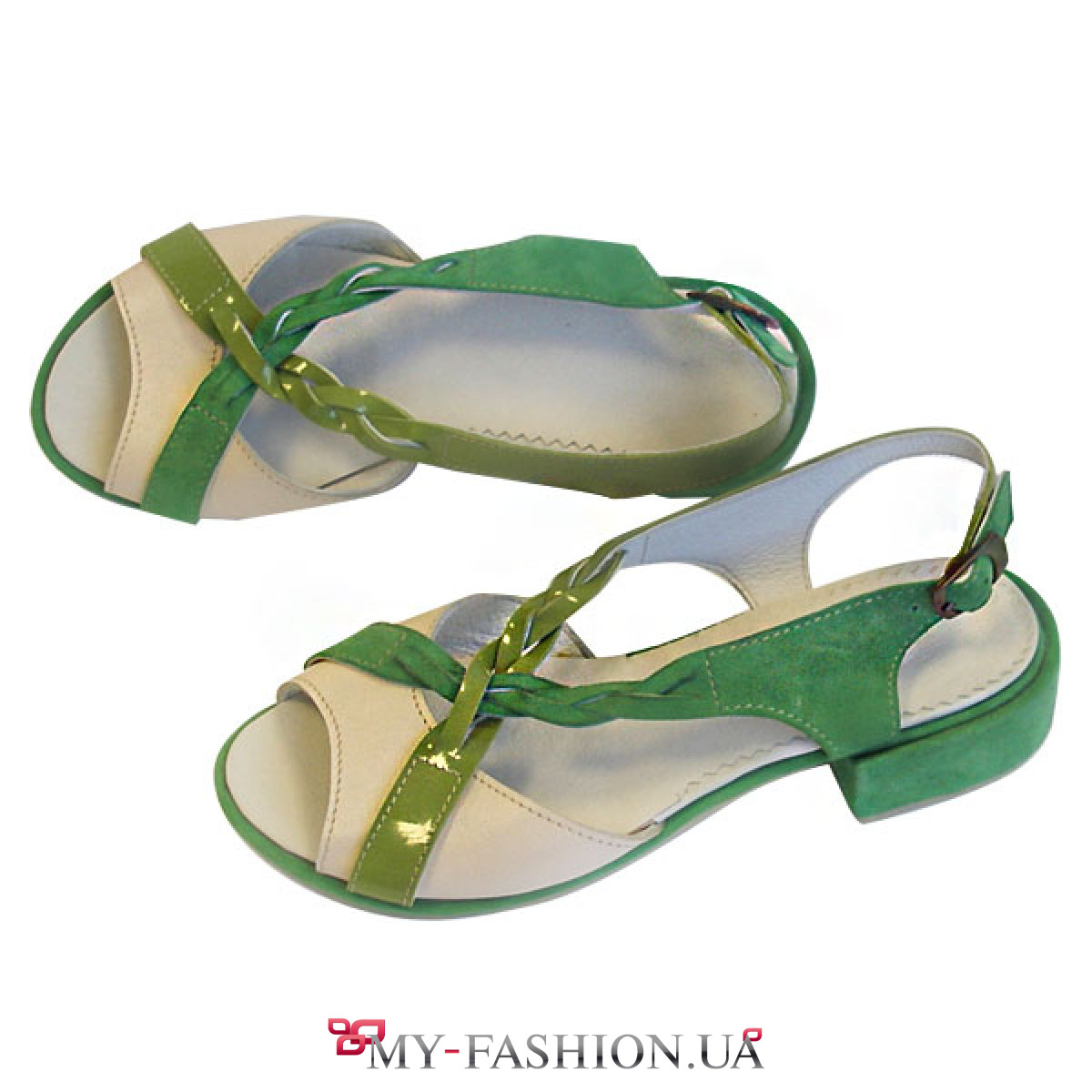 Женские дизайнерские босоножки, выполненные из эффектного сочетания бежевой лицевой кожи, зелёной замши и салатовой лаковой кожи. Изделие крепится на стопе при помощи классической пряжки. Модель имеет декоративный рант зелёного цвета и каблук высотой в 2 см, обтянутый в тон ранту. Очень привлекательная и удобная обувь. Отлично смотрится как с шортами или брюками, так и с летними платьями. Наличие размеров уточняйте. Можно изготовить на заказ в любом необходимом размере.