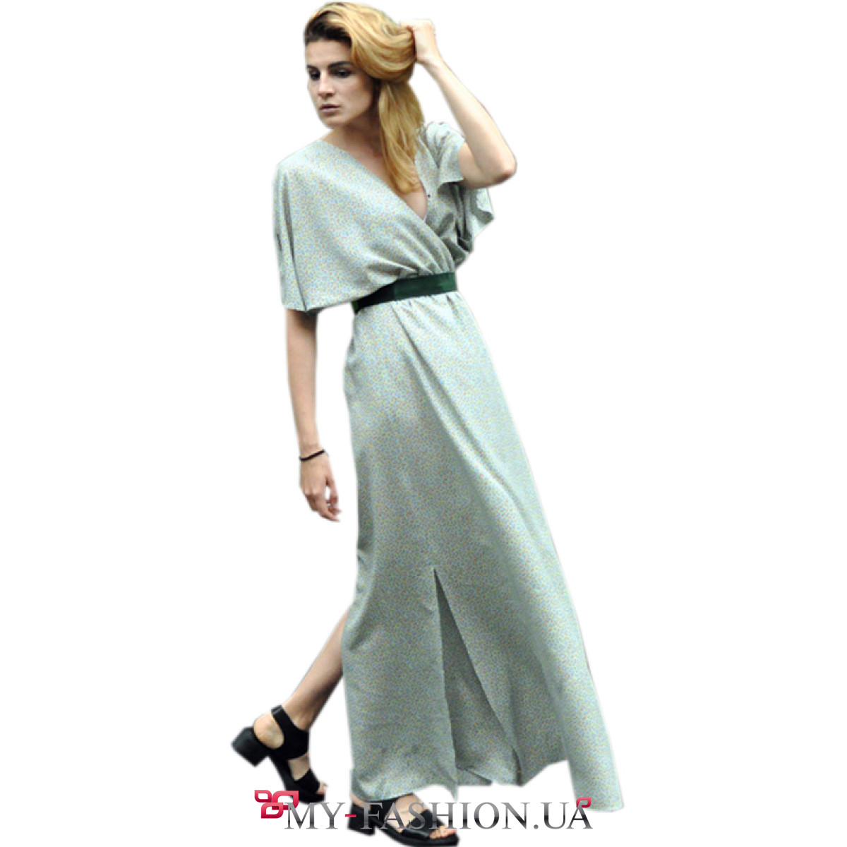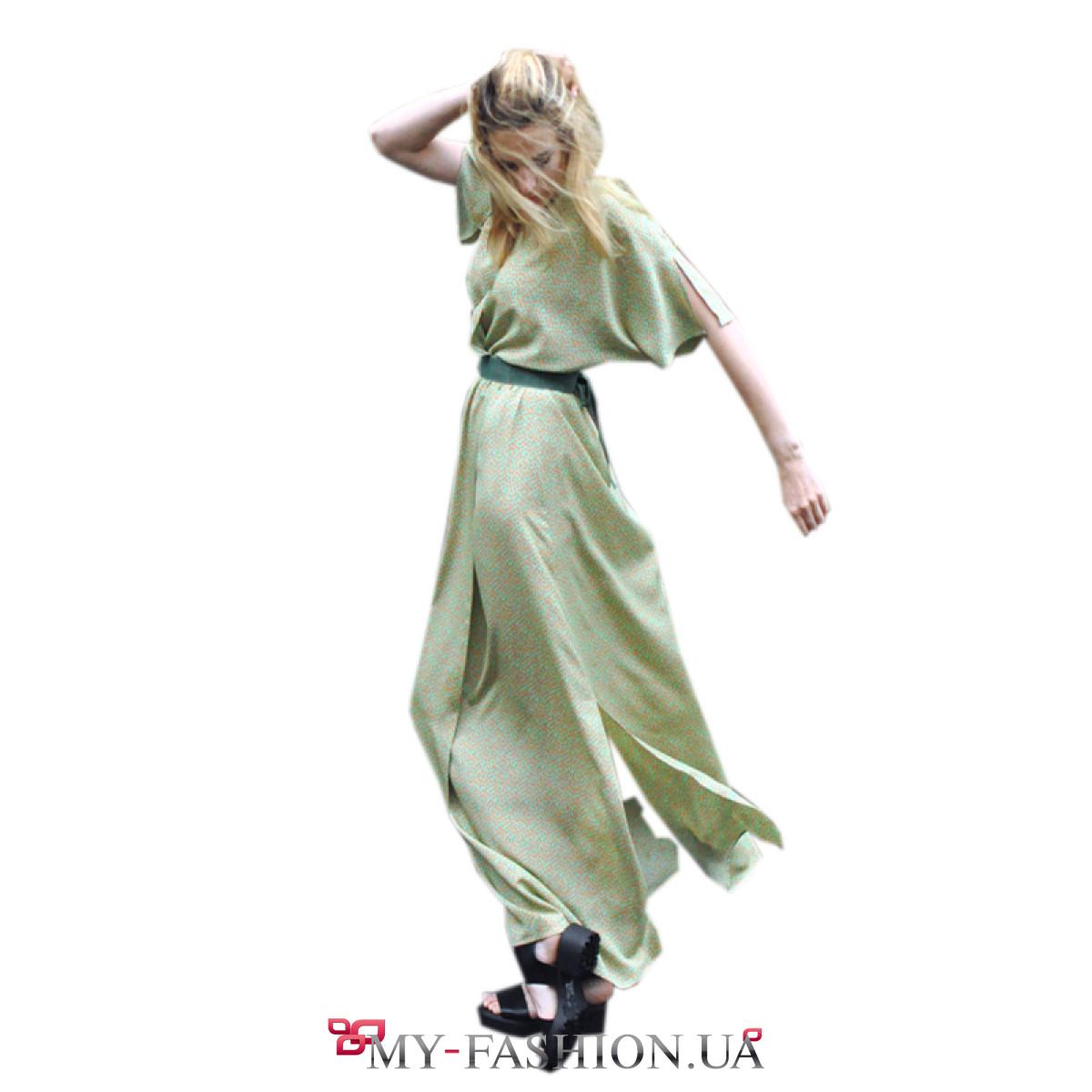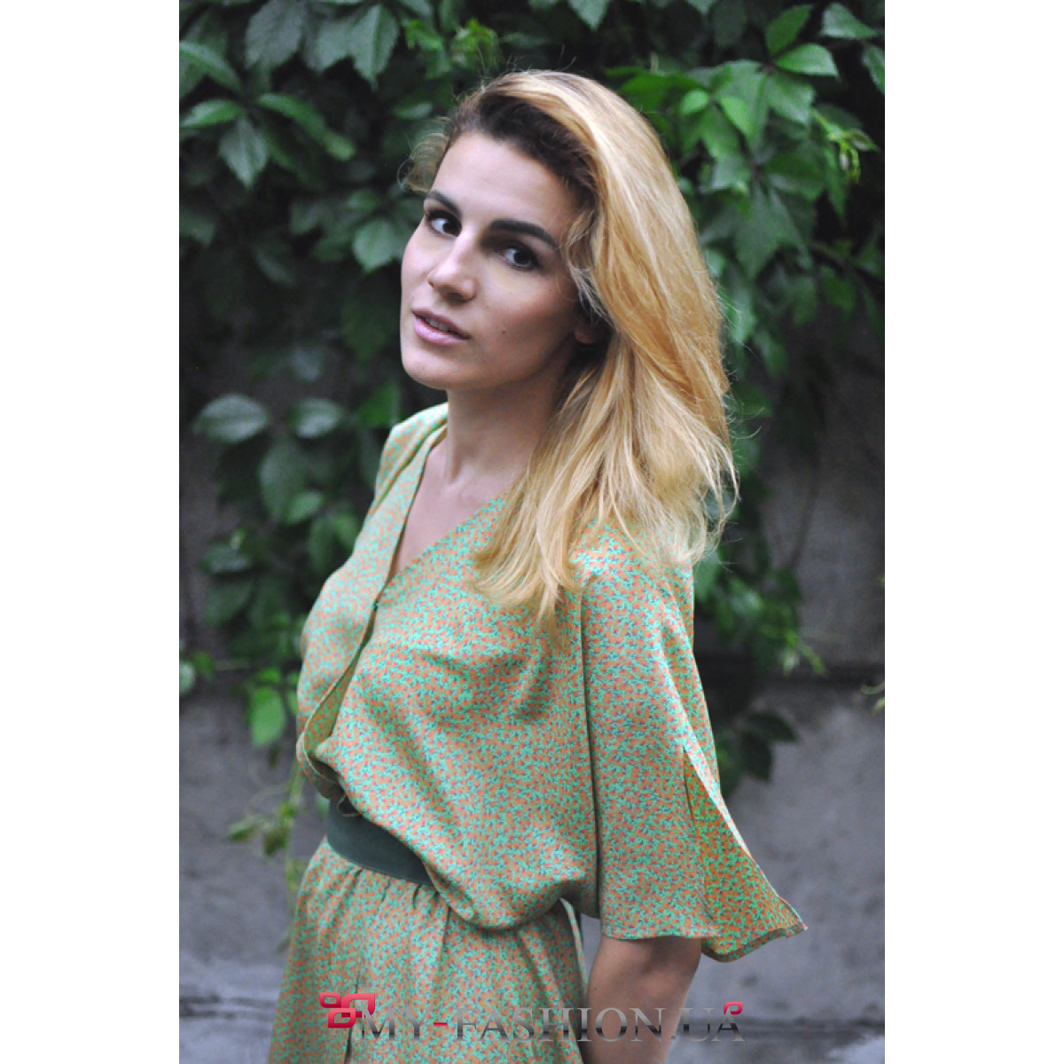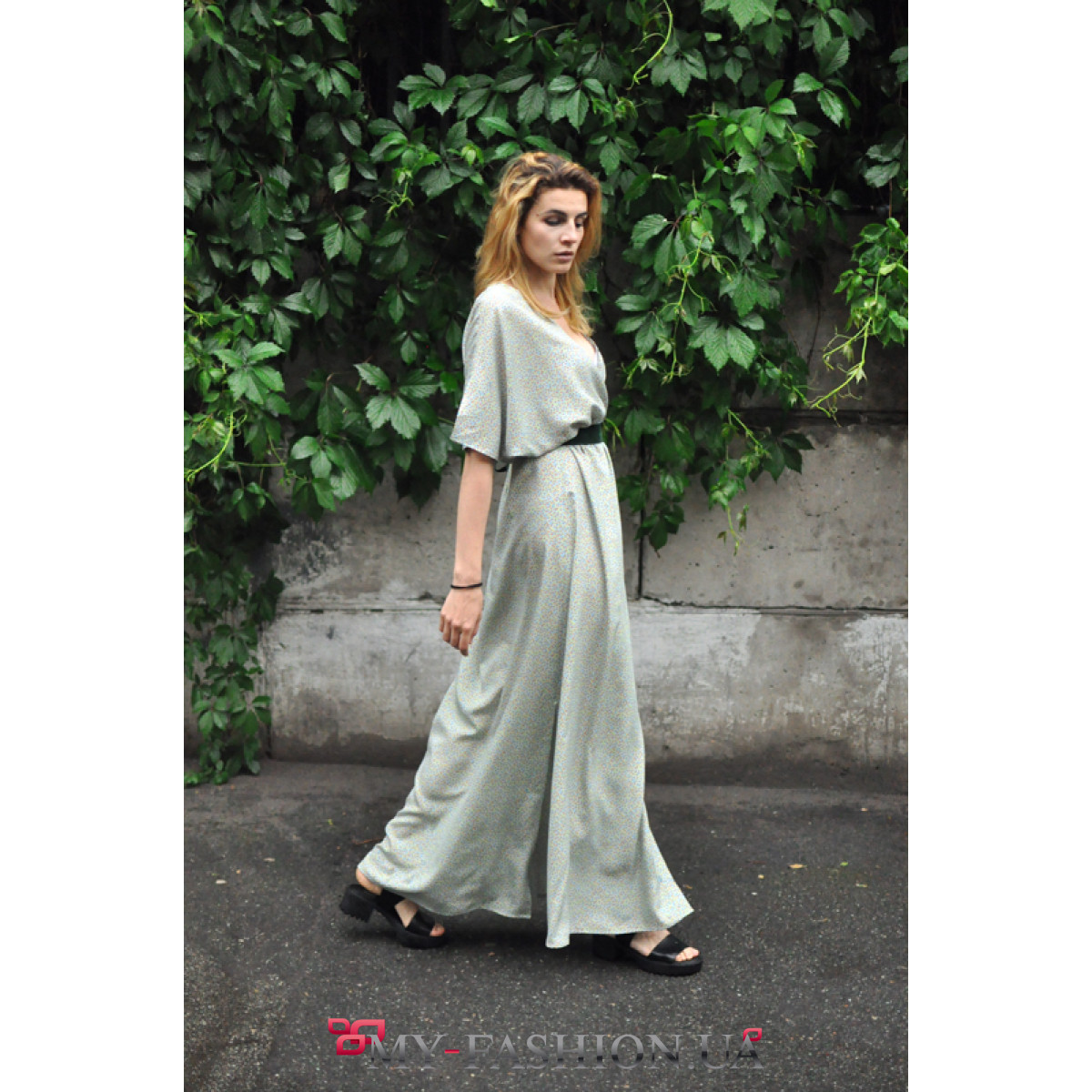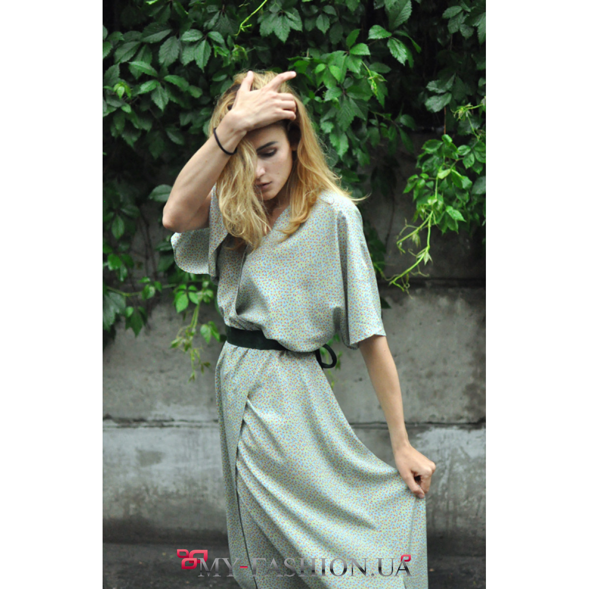 Очень свободное, лёгкое и удобное дизайнерское платье цвета хаки с необычным мелким принтом. Изделие с цельным рукавом до локтя, свободная полочка запахивается, создавая ощущение максимального домашнего комфорта. Талию подчёркивает тёмный пояс. Оригинальные разрезы на рукавах гармонично перекликаются со шлицами на длинной прямой юбке. Состав: 100% полиэстер. В наличии размеры 42, 44, 46. Также эта модель представлена в голубом и оранжевом цветах.