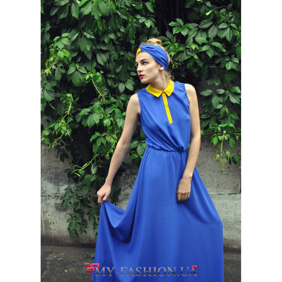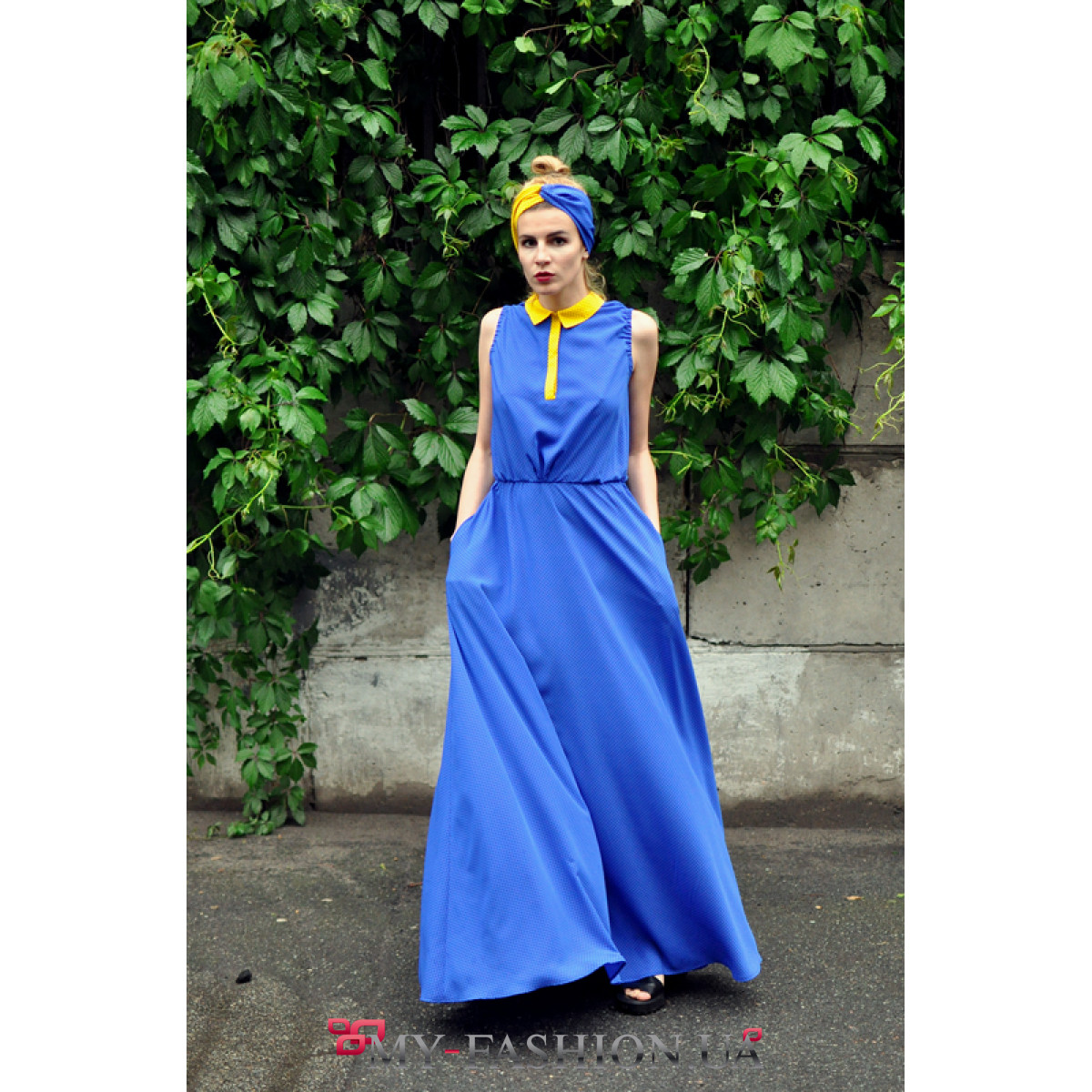 Дизайнерское платье ярко-синего цвета в мелкий горошек выполнено из высококачественной вискозы. Изделие спортивного силуэта, без рукавов, с воздушной прямой юбкой. Талия посажена на резинку. Полочка украшена насыщенно-жёлтым воротником под горло и вертикальной вставкой, прячущей застёжку. В комплекте с платьем идёт пояс, который можно использовать как дополнительное украшение для причёски или сумочки. Состав: 100% вискоза. Доступно в разных размерах.