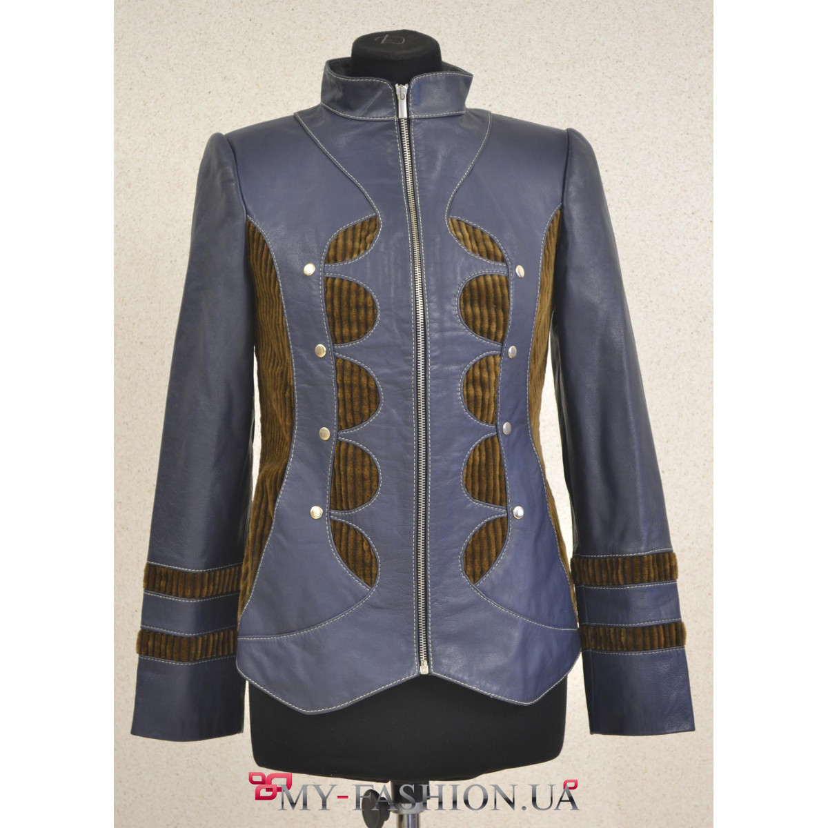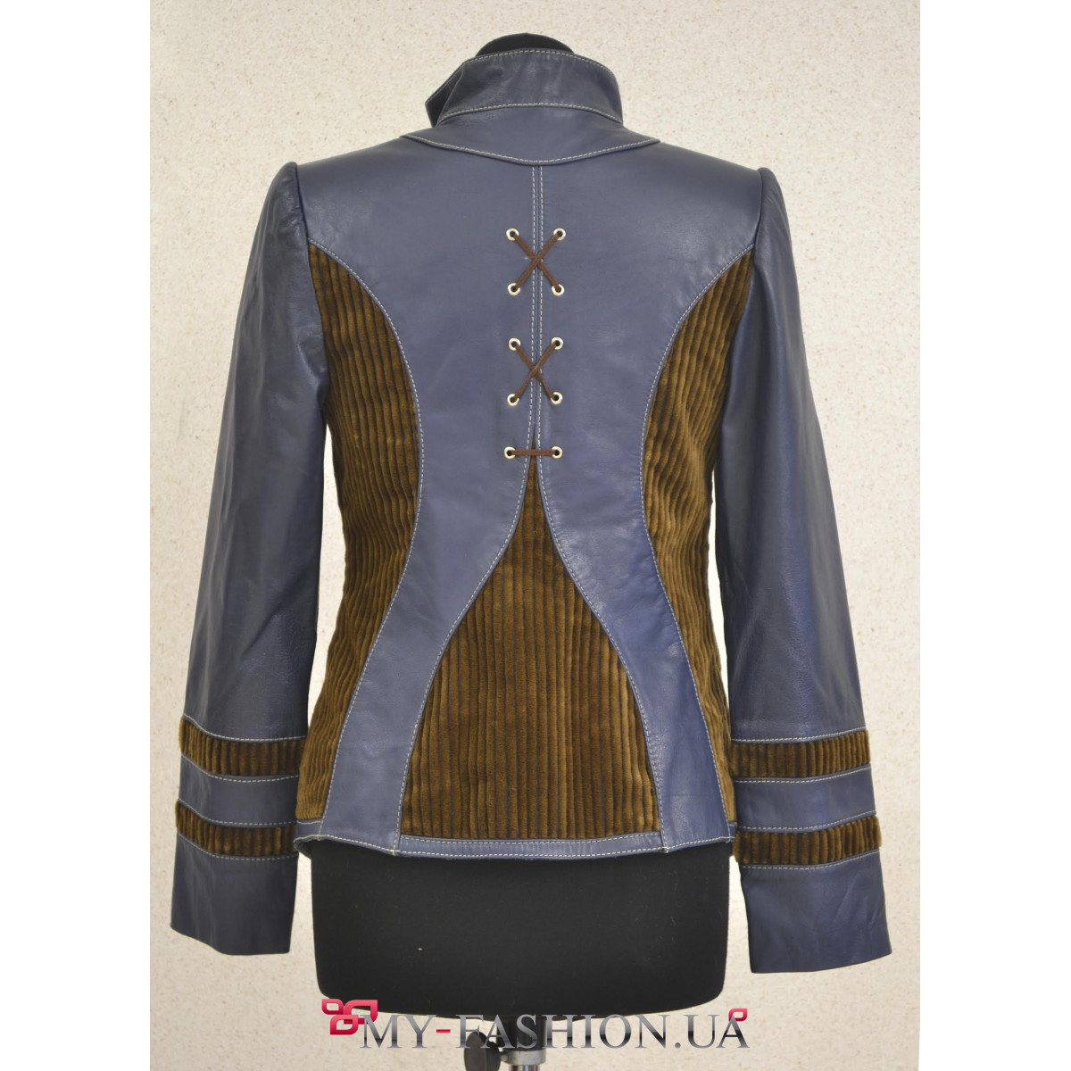 Женская куртка из натуральной кожи со вставками из коричневого вельвета. Изделие декорировано шнуром на спинке и контрастной отстрочкой. Куртка полуприталенного силуэта с замком-молнией, имеет воротник-стойку и фигурную линию низа. Посажена на качественную подкладку. Дополните ваш гардероб яркой обновкой, ведь эту вещь легко комбинировать с модными костюмами и офисными платьями. Эта модель утончает силуэт и придаёт необычности повседневному образу. Материалы: кожа, вельвет, подкладка (вискоза), кнопки, блочки, шнур, молния. Наличие размеров уточняйте. Можно изготовить на заказ в любом необходимом размере.