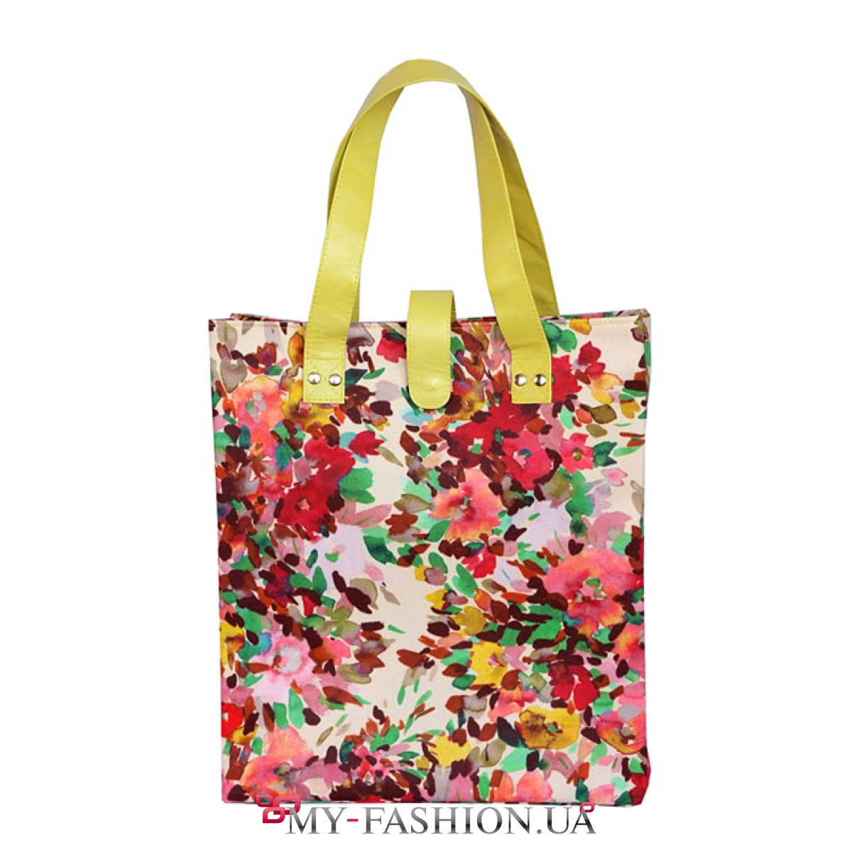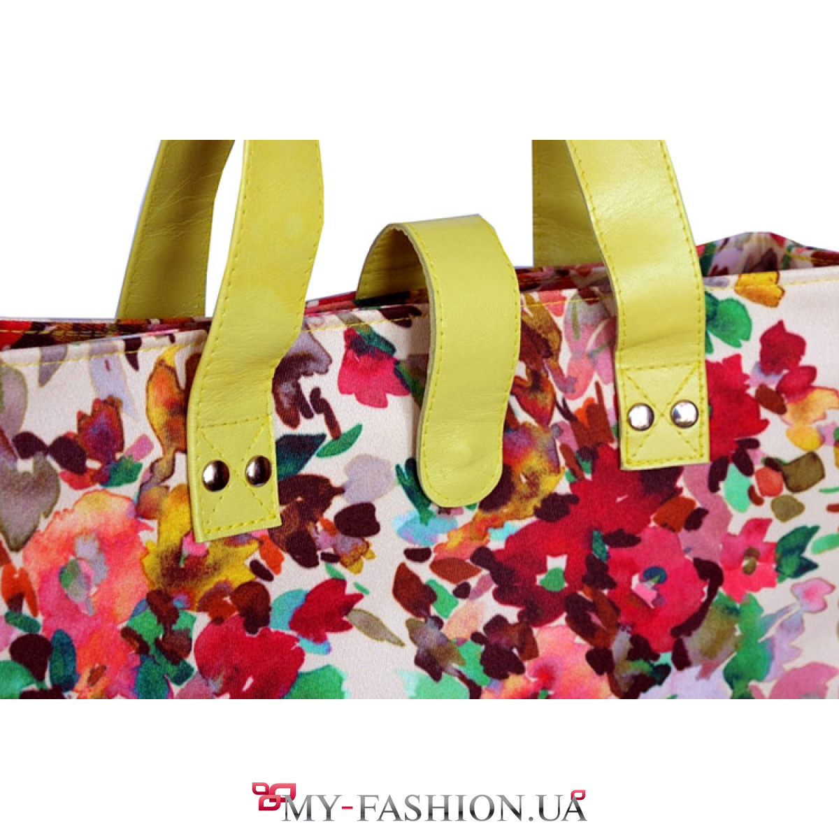 Женская модная сумка. Яркая сумка с цветочным принтом и кожаными шлейками . Сумка строгой прямоугольной формы с атласной подкладкой. Оснащена женская сумка карманчиками для мобильного телефона и различных мелочей. Закрывается модная сумка на магнитную кнопку. Просто восхитительный молодежный вариант женской сумочки, а к томуже, отличное дополнение к покупке трикотажных платьев и стильных ботинок.