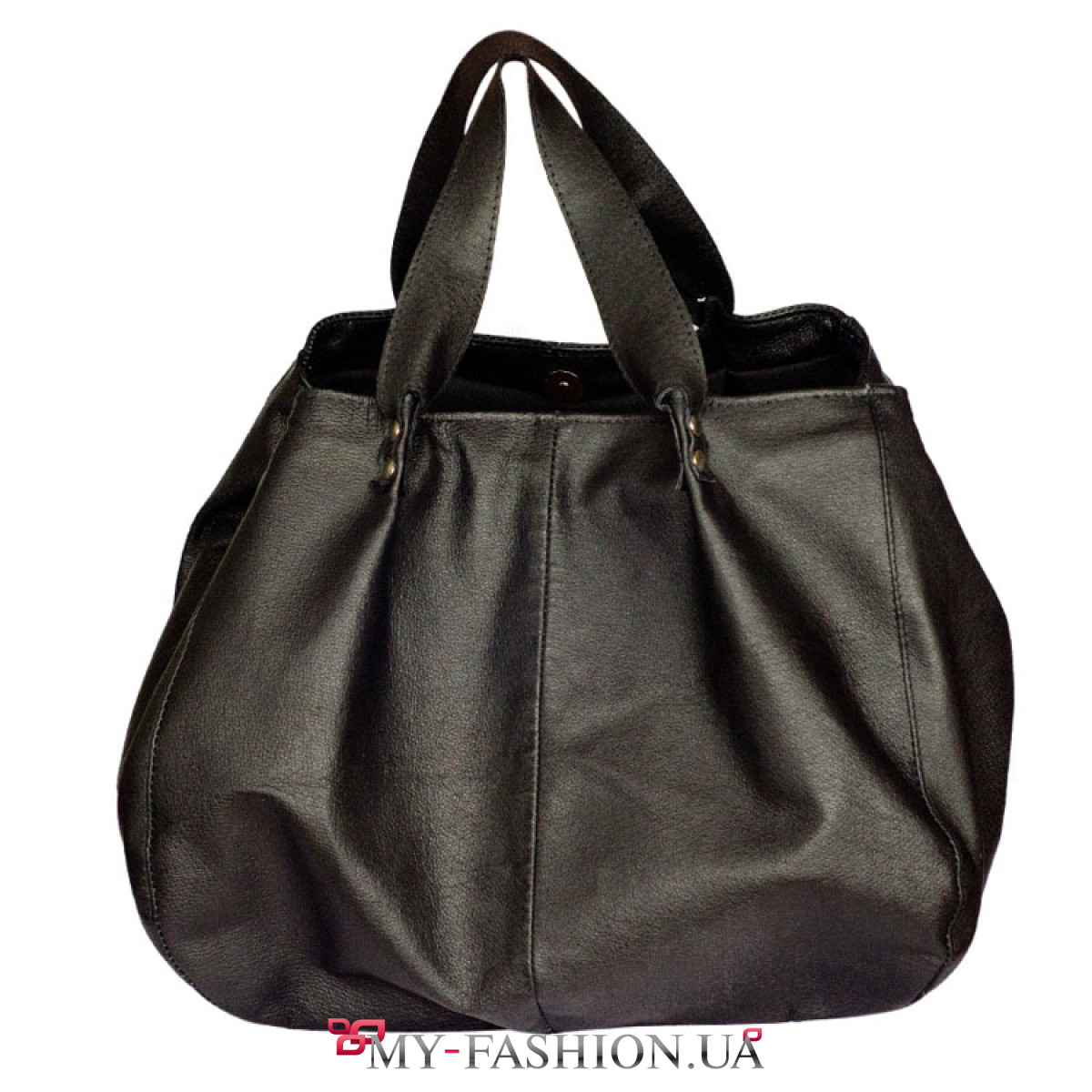 Черная вместительная сумка из натуральной кожи. Вместительная сумка размером 36 на 40 см- удобна и привлекательна. Закрывается модная сумка на магнитную кнопку внутри изделия, имеет 2-ва внутренних кармана. Подкладка хлопок. Декором сумки являются ее небольшие ручки, отделочные строчки на рельефных швах и конечно кнопки- крепежи. Просмотрите не мение привлекательные сумки с частичными вставками кожи, а также яркие сумки с кожаными ручками на плотных каркасах.