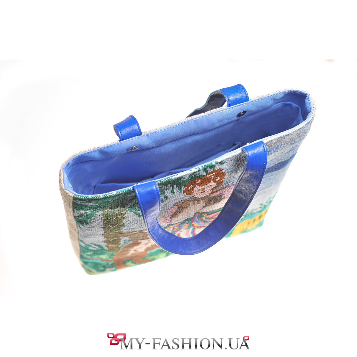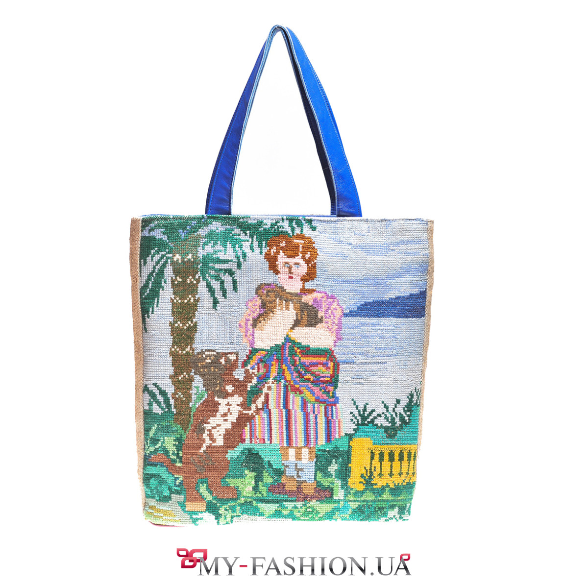 Оригинальная удобная и вместительная сумка молодёжного стиля. Изделие выполнено из комбинированных материалов: дно и ручки изготовлены из натуральной кожи, боковушки - из качественной парусины. Сумка украшена необычным изображением. Вышивка крестиком ручной работы наивысшего качества. Сумка на подкладке, застёгивается на магнитную кнопку. Материалы: натуральная кожа, парусина. Нитки для вышивки: итальянская шерсть. Размеры изделия: 36х38 см. Изготовлено в единственном экземпляре.